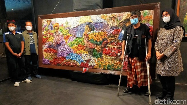 Penyematan pita merah tanda terjualnya lukisan Pasar Bunga karya Awiki ini dilakukan oekg Bupati Banyuwangi Ipuk Fiestiandani Azwar Anas, di Gedung Djuang 45 Banyuwangi, Senin malam (20/12/2021). Bupati Ipuk mengapresiasi terjualnya lukisan berukuran 300 X 140 cm itu.