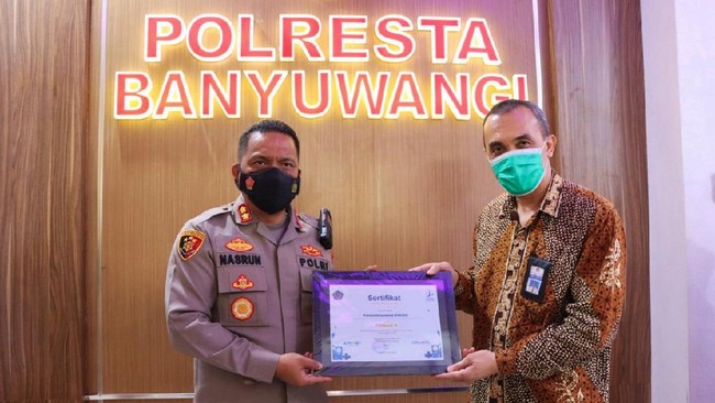 Penyerahan penghargaan dilakukan di Lounge Mapolresta Banyuwangi, Selasa (21/12/2021). Penyerahan dilakukan oleh Kepala KPPN Banyuwangi Biworo Hariwidjaya kepada Kapolresta Banyuwangi AKBP Nasrun Pasaribu.