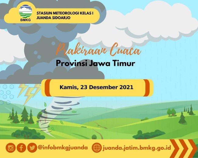 "Waspadai hujan intensitas sedang hingga lebat disertai petir dan angin kencang sesaat," tulis BMKG Klas I Juanda Surabaya dalam keterangannya yang diterima detikcom di Surabaya, Kamis (23/12/2021).