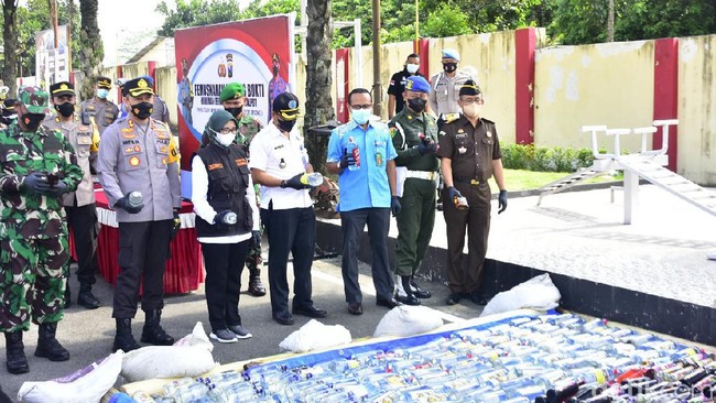 Usai apel gelar pasukan, kegiatan dilanjutkan dengan pemusnahan barang bukti sitaan berupa miras dan knalpot brong. Sebanyak 1.780 botol arak, 116 botol anggur merah dan 496 botol miras berbagai merek digilas alat berat.