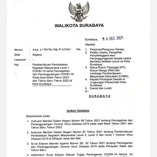 SE yang ditandatangani oleh Wali Kota Eri itu ditujukan kepada pimpinan/pengurus gereja, pelaku usaha, pengelola, penyelenggara atau penanggungjawab tempat usaha dan/atau fasilitas umum se-Surabaya, Ketua RT/RW dan LPMK, Kepala Perangkat Daerah di lingkungan Pemerintah Kota Surabaya, camat dan lurah Surabaya.