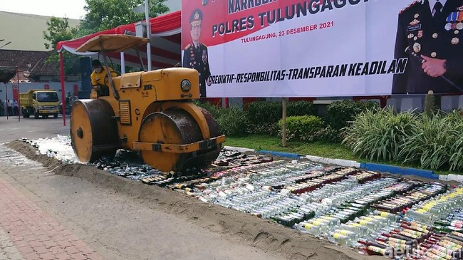 Pemusnahan miras juga dilakukan jajaran Polres Trenggalek. Ribuan botol miras dari berbagai jenis dan merk dimusnahkan dengan digilas alat berat.