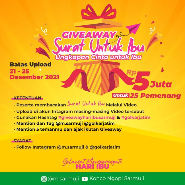 "Tidak semua orang bisa menyampaikan rasa sayangnya secara langsung kepada ibunya. Giveaway ini merupakan salah satu cara mereka untuk mengungkapkan rasa rasang kepada ibunya terlebih bagi mereka yang pemalu atau sedang terpisah jarak dengan ibu tercintanya," ujar Sarmuji.