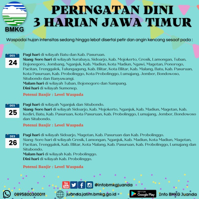 BMKG Klas I Juanda Surabaya mengeluarkan peringatan dini cuaca buruk yang akan terjadi dalam tiga hari ini. Sedangkan status banjir level waspada.