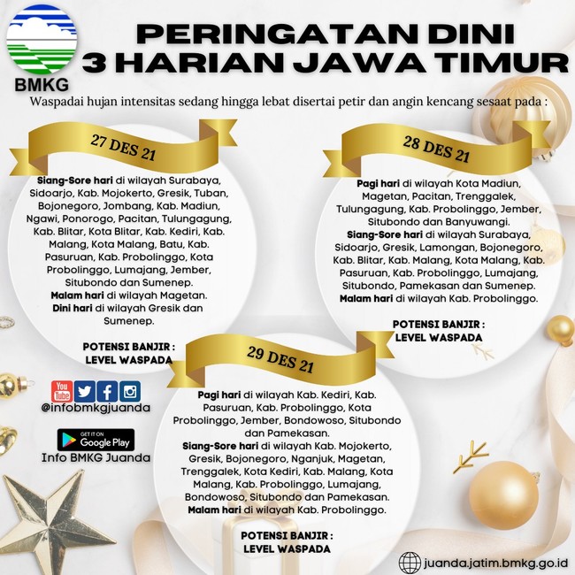 "Waspada hujan intensitas sedang hingga lebat disertai petir dan angin kencang sesaat," tulis BMKG Klas I Juanda Surabaya dalam keterangan yang diterima detikcom di Surabaya, Senin (27/12/2021).
