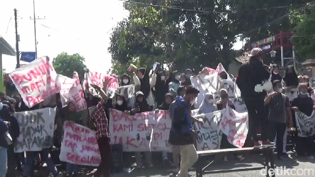 SMK tersebut berada di Jalan Veteran. Massa memblokir jalan menggunakan ban bekas. Mereka lalu orasi menyampaikan tuntutan.