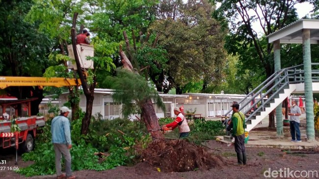 Usai angin kencang, petugas DKRTH yang datang segera membersihkan jalanan dari batang dan ranting pohon. Petugas memotong dan menyingkirkan pohon tumbang agar tak menutupi jalan.