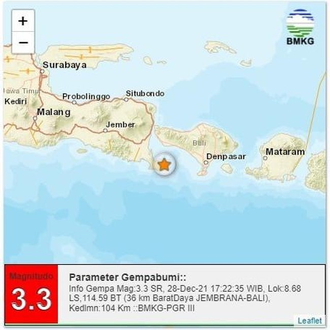 "Info Gempa Mag : 3.3 SR, 28-Dec-21 17:22:35 WIB," tulis BBMKG Wilayah III Denpasar dalam postingannya yang dilihat detikcom pukul 18.00 WIB.