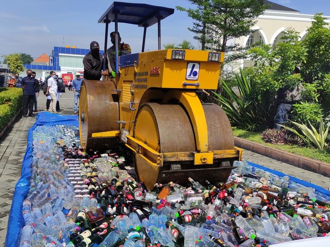 Pemusnahan dilakukan di halaman Mapolresta Sidoarjo Jalan Raya Cemengkalang, Rabu (29/12/2021) menggunakan alat berat. Selain botol miras polisi juga memusnahkan narkotika seperti, pil double L, daun ganja kering, pil ekstasi dan sabu.