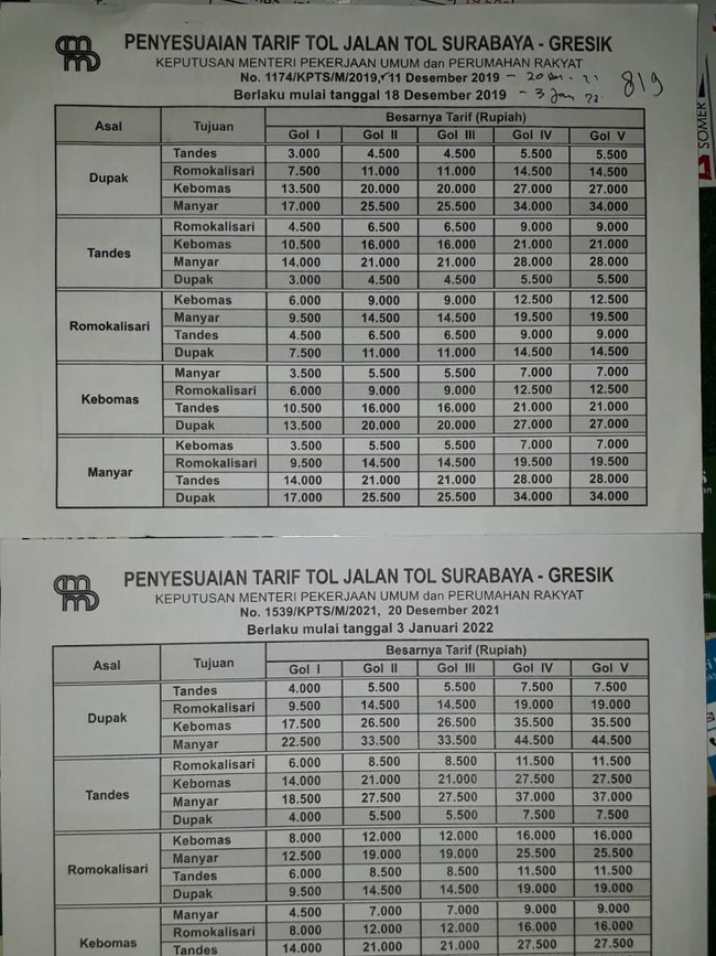 Untuk kendaraan golongan V dari Dupak menuju Tandes semula Rp 5.500 menjadi Rp 7.500. Sementara kendaraan golongan V dari Dupak menuju Manyar mulai Rp 34.000 menjadi Rp 44.500
