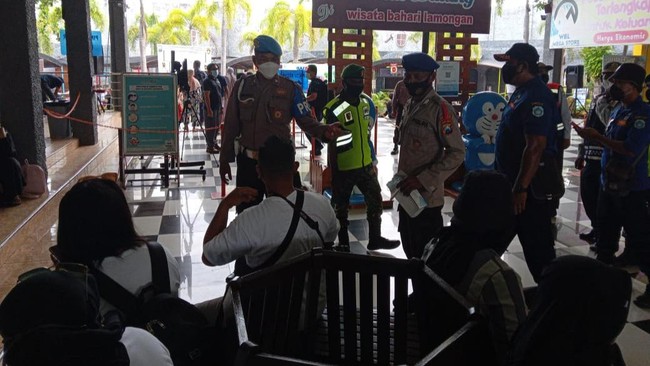 Petugas gabungan dari Kecamatan Paciran memelototi penerapan protokol kesehatan, terutama masker di Wisata Bahari Lamongan (WBL), Maharani Zoo dan Goa serta di wisata religi Sunan Drajat.