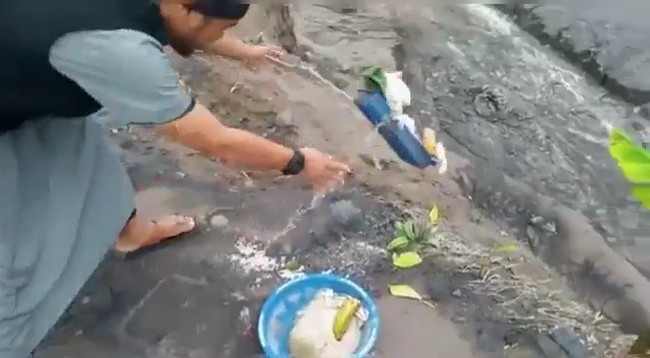 Video berdurasi 30 detik itu memperlihatkan seorang pria mengenakan tutup kepala dan rompi berdiri lalu mendekat ke sebuah sesajen yang diletakkan di atas tanah. Ada dua sesajen yang terlihat yakni buah dan nasi yang masing-masing berada di wadahnya.