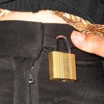 Seragam celana panjang warna hitam itu, menggunakan resleting pada bagian pinggang sebelah kiri. Di atas resleting diberi pengait dari kain. Pada pengait inilah, gembok dipasang.