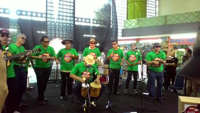 Saut bersama jajaran Direksi PT KAI tengah berjoget menikmati alunan musik di lobi utama Stasiun Gambir, Jakarta Pusat, Jumat (13/5/2016). Tentu saja ini menarik perhatian perhatian penumpang kereta api, salah satunya adalah Zaenal Airifin (48).