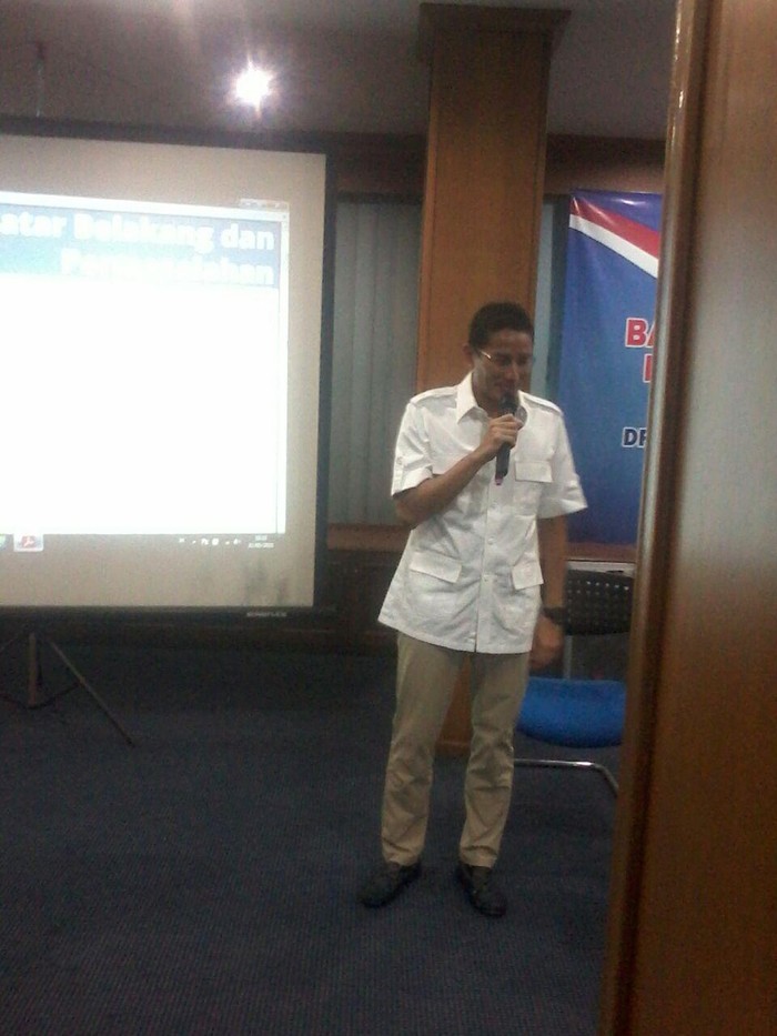 Sandi tiba sekitar pukul 10.00 WIB. Mengenakan kemeja empat kantong khas Gerindra, Sandi datang meneteng portofolionya.