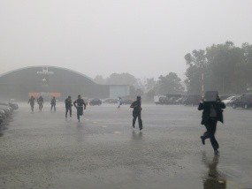 Pantauan detikcom, langit di atas lokasi upacara tampak mendung tipis. Hujan gerimis yang mulai turun sejak pukul 09.00 WIB semakin lebat. Hujan yang sama juga terjadi saat gladi resik Minggu (3/10/2010) lalu.