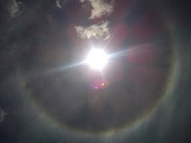 Halo merupakan fenomena alam biasa berupa cahaya yang mengelilingi matahari. Kejadian ini merupakan hasil pembelokan cahaya matahari oleh partikel uap air di atmosfer. Namun awas, jangan mencoba melihatnya langsung dengan mata telanjang.
