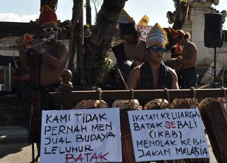 Puluhan warga yang tergabung dalam Ikatan Keluarga Batak se-Bali (IKBB) berunjuk rasa di depan Konsulat Malaysia di Kuta, Jl Pantai Kuta, Jumat (22/6/2012). Aksi ini dilakukan dengan menggunakan pakaian khas Batak dan memamerkan tarian Tor-tor.