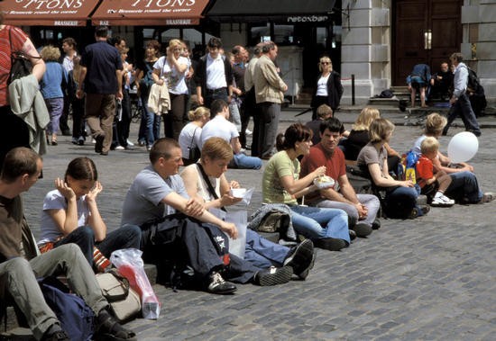 Orang-orang bertemu, berkumpul, mengobrol alias rendezvous dan duduk di lapangan tanpa alas di tengah-tengahnya sambil menikmati sinar matahari, sementara di sisinya terdapat kafe-kafe dan orang-orang berlalu lalang.