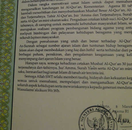 Setelah Asmaul Husna, halaman selanjutnya memuat sambutan Menteri Agama RI yang secara garis besar berisi tujuan dan harapan diadakannya mushaf Quran ini. Di sisi kanan bawah halaman yang sama terdapat tanda tangan Menag Suryadharma Ali tanggal 8 Maret 2011.