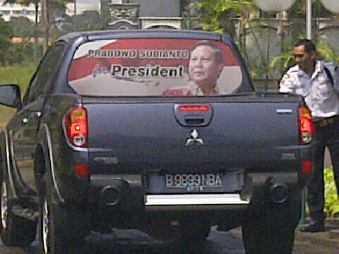 Sejumlah kendaraan terlihat di kaca belakangnya memasang gambar Prabowo lengkap dengan tulisan for president. Seorang pembaca detikcom, Dodi, pada Kamis (23/8/2012) melihat kendaraan itu melintas di kawasan BSD. Dia sempat keheranan, apakah musim kampanye Pilpres sudah dimulai?