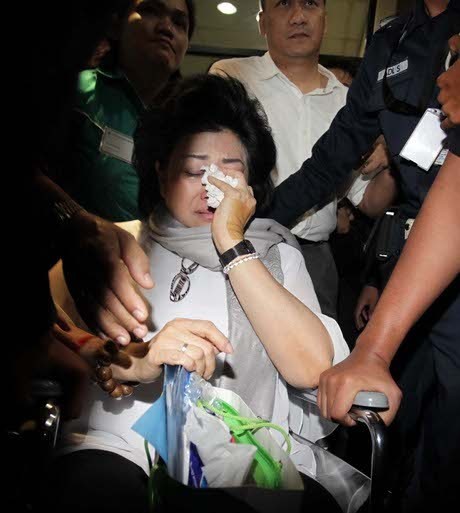 Di atas kursi rodanya, Hartati terus menangis. Dia tampak menyeka air matanya berkali-kali dengan tisu di tangannya. Matanya sembab dan terlihat merah. Dia kemudian didorong terus masuk lift untuk dibawa ke ruang penyidik KPK.