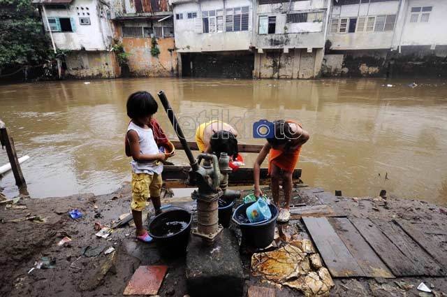 Musim kemarau yang melanda Jakarta dan sekitarnya membuat pasokan air ke instalasi pengolahan, terganggu. Warga yang kehabisan air pun terpaksa membeli air pada pedagang keliling.