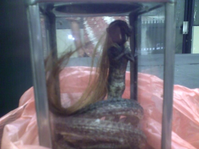 Pantauan detikcom, Jumat (16/11/2012) di Mapolres Jakbar, Jl S Parman, Jakarta, sebuah jenglot ditaruh polisi di sebuah toples persegi panjang berukuran 10x20 cm. Jenglot itu berbentuk ular dengan rambut panjang sekitar 10 cm. Jenglot itu juga memiliki gigi taring.