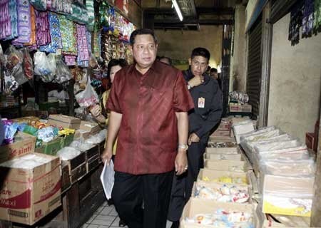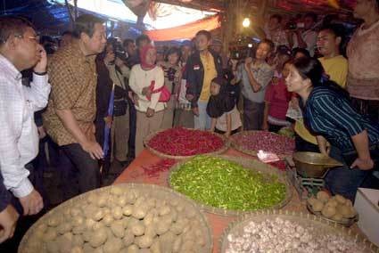 Usai berdialog sebentar, SBY kemudian melanjutkan inspeksinya ke sudut lain pasar.