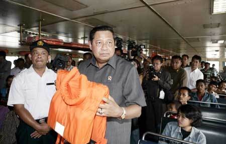 SBY berkeliling memeriksa untuk memastikan kelengkapan alat-alat keselamatan yang tersedia di KM Baruna. SBY berdialog dengan salah satu penumpang kapal tersebut. Presiden juga memeriksa salah satu pelampung di KM Baruna.
