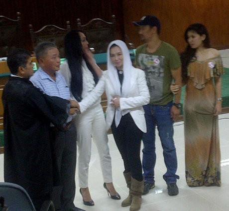 Bersama ayah Angelina Sondakh, Prof Lucky Sondakh, pengacara Angie, T Nasrullah, Angie dan Reza berfoto bersama dengan latar belakang meja hakim. Tampak juga adik alm Adji Massaid, Mudji, bersama kekasihnya yang juga artis dangdut, Icha.