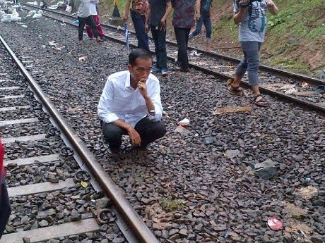 Karung itu diangkat Jokowi ke atas lori yang stand by di atas rel kereta api untuk selanjutnya didorong ke arah pinggiran tanggul, Kamis (17/1/2013). Jokowi dan pekerja PU sibuk mengangkut karung-karung tersebut. Warga sekitar pinggiran rel juga berkerumun menyaksikan perbaikan tanggul jebol. Karung-karung batu kerikil itu akan ditata menutup di pinggiran tanggul jebol.