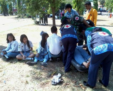 Mereka yang mulai terlihat lemas kemudian dibantu petugas kesehatan untuk berjalan ke tepi lapangan. Di pinggir lapangan, beberapa peserta upacara dibaringkan dan diberi bantuan pernafasan menggunakan tabung oksigen.