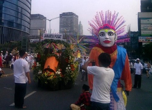 Ada satu yang unik yakni dari kontingen Jakarta Pusat. Jika yang lain hanya bedug, wilayah administratif ini menggiring 4 ondel-ondel dan membawa musik elektronik.