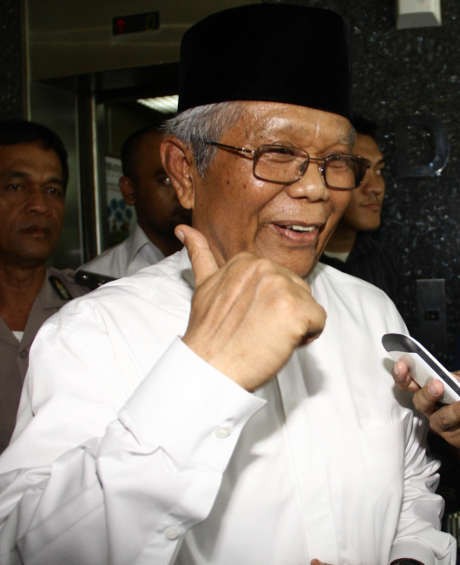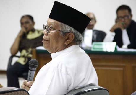 Hilmi yang disebut 'engkong' oleh anaknya, M Ridwan, ini tiba di gedung Pengadilan Tipikor, Jl HR Rasuna Said, Kuningan, Jaksel, sekitar pukul 10.38 WIB, Senin (21/10/2013). Dia mengenakan baju koko dan peci hitam.