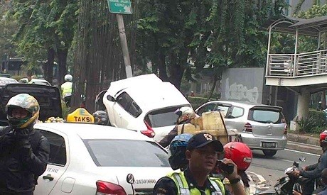 Jakarta - Mobil Nissan Juke ringsek setelah menerabas pembatas jalan dan rambu jalan persis di depan Plaza Festival, Jalan HR Rasuna Said, Jaksel. Mobil saat itu melaju kencang dari arah Setiabudi ke perempatan Kuningan.