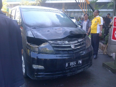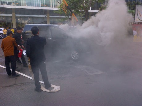 Mobil bernomor polisi B 8924 PN ini terbakar sekitar pukul 09.20 WIB, Jumat (22/11/2013). Kepulan asap hitam terlihat di mobil ini. Hal tersebut menarik perhatian peserta Rapimnas Golkar.