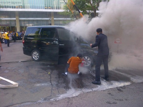 Ahmad, sopir mobil tersebut mengaku asap mulai terlihat saat mobil memasuki hotel tersebut. Satpam hotel itu memberi informasi kalau mobil itu berasap sehingga pengemudi mobil langsung meminggirkan mobil itu di dekat pintu keluar hotel.
