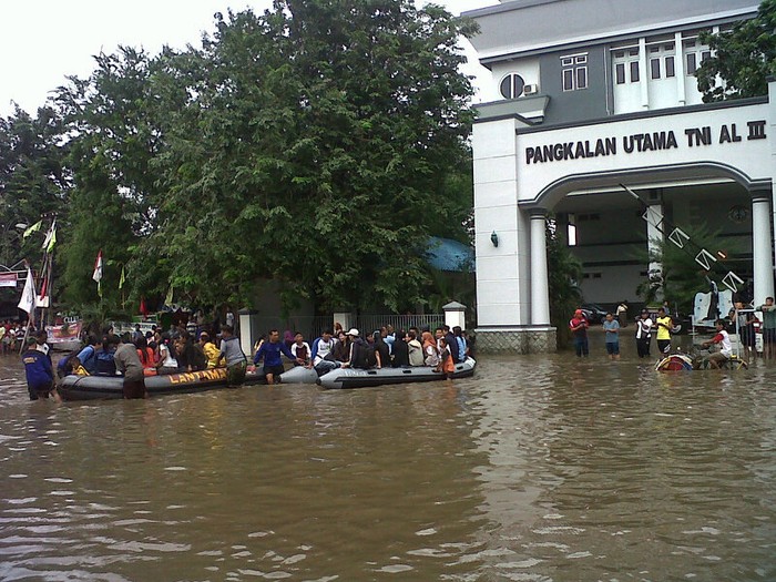 Di depan markas Lantamal III, terlihat beberapa sekoci dan perahu karet berseliweran. Sekoci itu membantu warga yang hendak melintasi Jalan Gunung Sahari. Sekoci itu dioperasikan personel TNI AL yang rela menceburkan diri ke dalam banjir untuk mendorong sekoci.