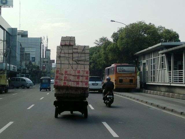 Seorang pembaca detikcom berhasil mengabadikan momen saat bajaj tersebut memuat puluhan kardus belanjaan. Bajaj tersebut dengan santai melintas di Jalan Juanda, Jakarta Pusat.