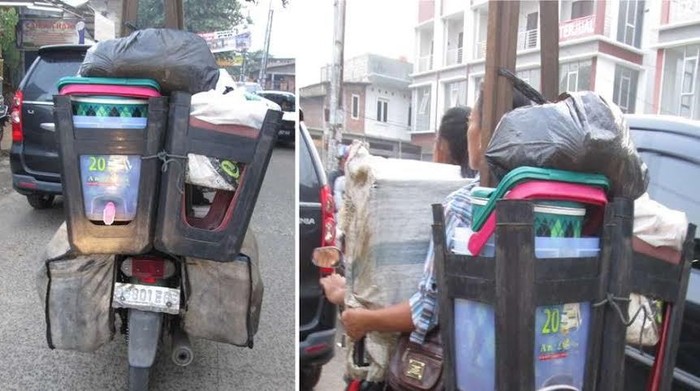 Mereka nampak membawa kursi, tempat nasi, dan berbagai perlengkapan lain yang akan digunakan untuk membuka sebuah warung makan. Di tengah kemacetan jalanan, mereka nampak santai dan tidak kesusahan membawa barang sebanyak itu.