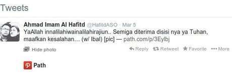 "YaAllah innalilahiwainalilahirajiun.. Semiga diterima disisi nya ya Tuhan, maafkan kesalahan nya, sayangilah orang" disekitar nya. Amin ya Allah," tulis Hafitd yang diunggah pada Rabu (5/3/2014).