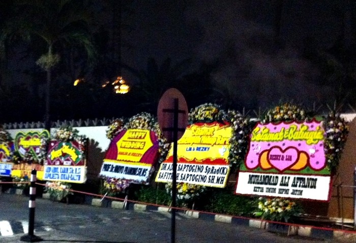 Di lokasi Hotel Mula, terpajang puluhan karangan bunga berisi ucapan untuk kedua mempelai di beberapa bagian luar tempat resepsi. Di antaranya karangan bunga dari Sekjen MK Janedjri M Gaffar, Gubernur Jawa Tengah Ganjar Pranowo, mantan Ketua MA Harifin Tumpa, Bupati Bogor Rachmat Yasin, dan politikus Maruar Sirait.