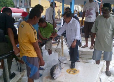 Di dalam kapal yang berawak 24 orang itu, nelayan sempat menunjukkan hasil tangkapan mereka, dua ikan tuna besar berukuran sekitar 1 meter. Kehadiran JK itu menarik perhatian warga yang melihat dari pinggir pelabuhan.