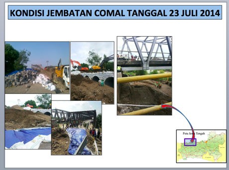 Dari foto tampak kondisi terkini jembatan Comal hingga Rabu (23/7/2014). Sejumlah pekerja masih sibuk melakukan perbaikan.