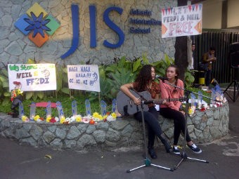 Acara renungan tersebut diadakan di depan gerbang masuk JIS di Jalan Terogong Raya No 33, Cilandak, Jakarta Selatan, Jumat (1/8/2014) sore. Ada puluhan orang yang hadir, yang terdiri dari guru, staff, orang tua, serta siswa-siswi JIS.