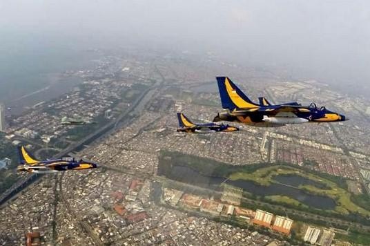 Empat jet tempur TNI AU terlihat bermanuver di langit Jakarta. Pesawat-pesawat ini sedang berlatih untuk melakukan fly pass di Istana Negara. Fly pass ini rencananya akan dilakukan untuk memeriahkan peringatan detik-detik proklamasi HUT ke-69 RI tanggal 17 Agustus 2014.