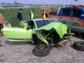 Kecelakaan dahsyat lain juga dialami Lamborghini warna hijau bernopol DK 9 RA yang menabrak separator di exit Tol Joglo, Jakarta Barat. Mobil mewah yang dikemudikan Tanto Hariyadi (40) itu mengalami pecah ban belakang sebelah kiri hingga akhirnya menabrak separator dan ringsek.