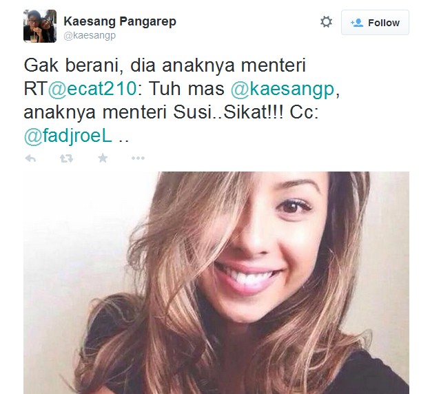 Kicauan Kaesang itu kemudian membuat ramai. Banyak yang mencari tahu soal Nadine Kaiser, putri Menteri Susi yang cantik dan tengah menimba ilmu sebagai pilot di AS. Bahkan, Menteri Susi sampai mengungkapkan kalau putrinya keheranan karena banyak yang ingin mengenalnya.