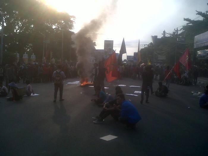 Polisi mengepung aksi mahasiswa dari sisi timur dan barat, sehingga mahasiswa hanya berorasi di pertigaan UIN Sunan Kalijaga, Kamis (20/11/2014). Selain memblokir jalan, mahasiswa membakar ban bekas di tengah jalan.